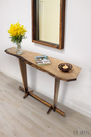 Elevate your space with our exquisite hand-made walnut console table. Crafted from 100% solid walnut, this piece showcases the natural beauty and rich grain patterns unique to each wood selection.